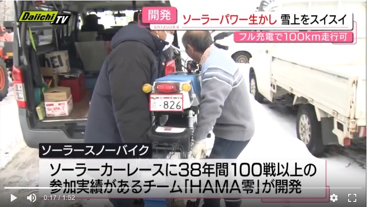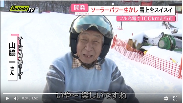 会場となったのは、営業が終わったあとの夕暮れのスキー場。走行テストをしたのは、ソーラーパネルで充電できるEVバイク、その名も「ソーラースノーバイク」なのです。開発を手掛けたのは、ソーラーカーレースに38年間、 100戦以上参加し続けるチーム「HAMA零」。この日は、裾野市の「スノーパーク・イエティ」で、リーダーの山脇さんらが、雪の上での乗り心地や安全性を確かめました。
